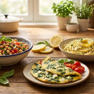A omelete é uma opção prática e versátil. Para prepará-la, você vai precisar de: – 2 ovos o 1/2 xícara de espinafre picado o 1/4 de xícara de queijo (fresco ou de sua preferência) o Sal e pimenta a gosto.